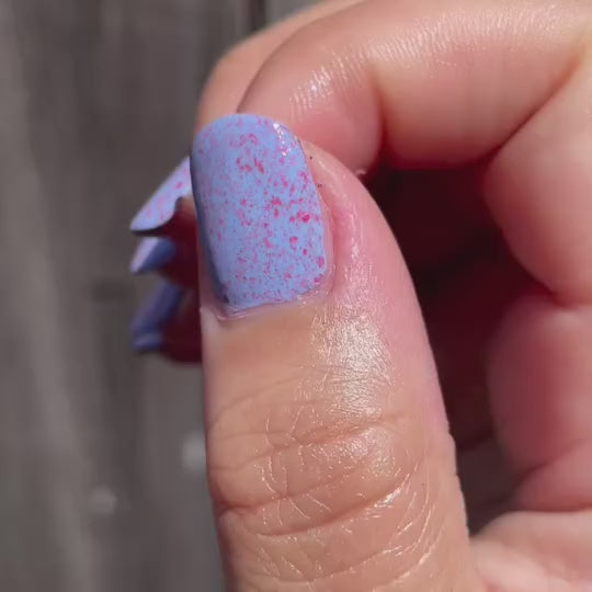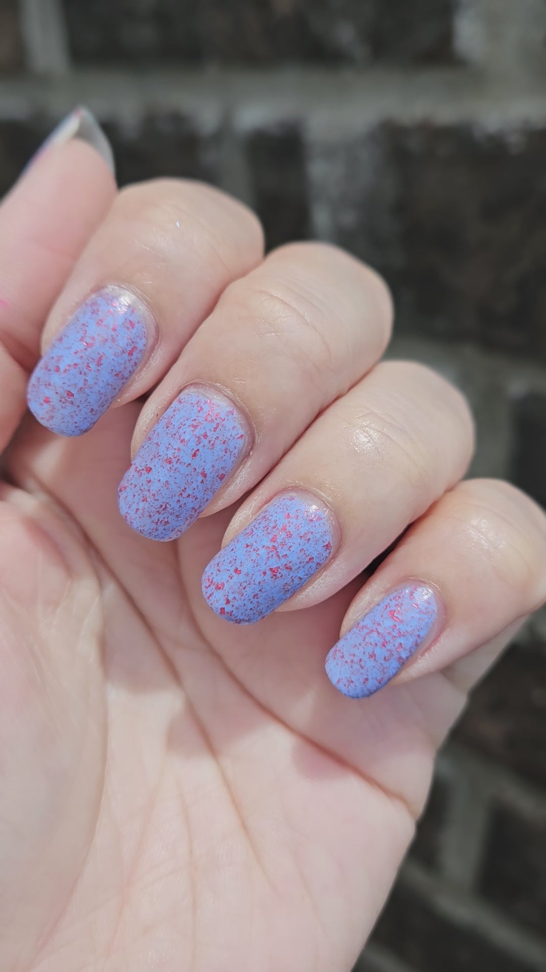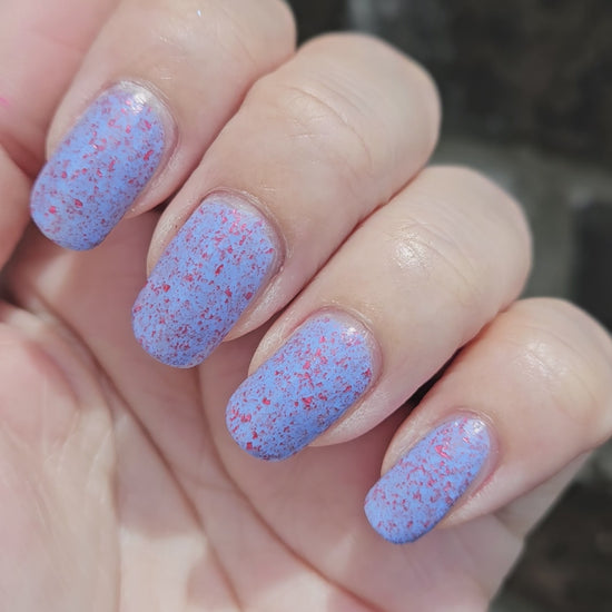 Said It Nicely the First Time is a periwinkle crelly filled with scattered red flakes and a soft violet glow in the base.
